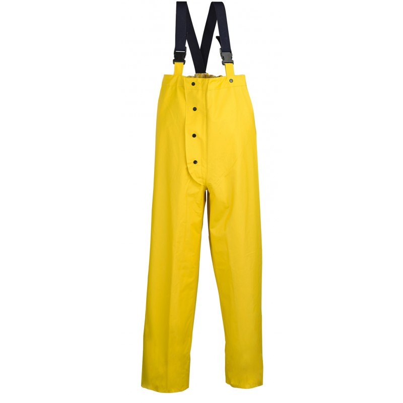 Cerata leggera ed impermiabile in poliestere giallo con spalmatura in PVC e cuciture saldate ad alta frequenza, dotata di larghe bretelle elastiche registrabili, dorsale elastica con fondo saldato e rinforzato, ampia apertura anteriore (dal petto al cavallo) con bottoni a pressione e cinghiette regolabili alle caviglie con chiusura a velcro.