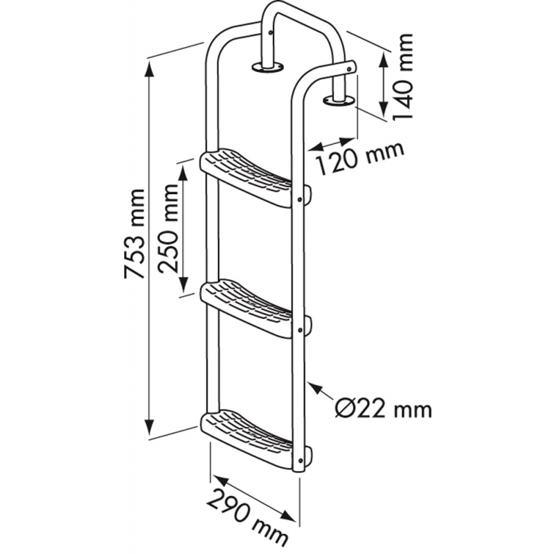 Scaletta ribaltabilein acciaio inox AISI 316, Ø tubo mm 22, gradini in plastica antiscivolo.Applicazione sopra la plancetta
