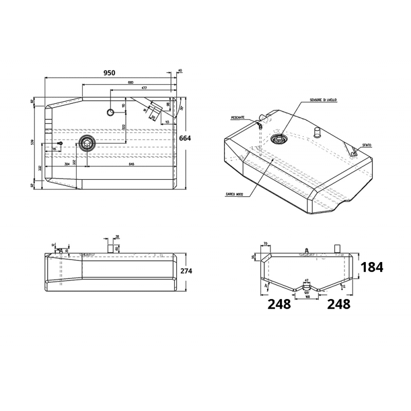 Serbatoio rigido per carburantecostruito in polietilene reticolato di colore neutro, certificato CE in accordo con la direttiva 94/25/CE secondo normativa ISO 10088 - ISO 21487.Forma carenata, a sezione trapezioidale rovesciata che segue il profilo e l’inclinazione dello scafo al fine di sfruttare al massimo lo spazio di sentina. Provvisto di sensore di livello universale, può funzionare o a 10-180 ohm o a 240-33 ohm.Inserti per imbarco, sfiato Ø mm. 16, pescante e ritorno Ø mm. 12. Ogni serbatoioè collaudato singolarmente.