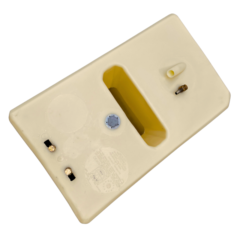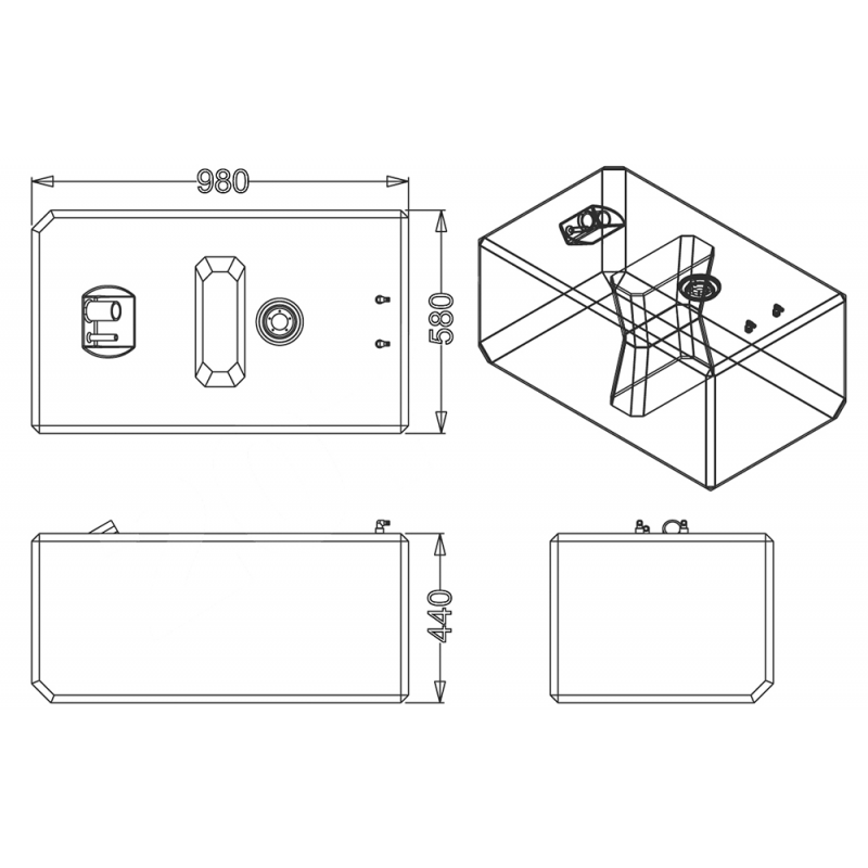 Serbatoio rigido per carburante costruito in polietilene reticolato di colore neutro, certificato CE in accordo con la direttiva 94/25/CE secondo normativa 10088 e ISO 21487. Provvisto di sensore di livello universale, può funzionare o a 10-180 ohm o a 240-33 ohm.Inserti per imbarco, sfiato Ø mm. 16, pescante e ritorno Ø mm. 12. Ogni serbatoio è collaudato singolarmente.