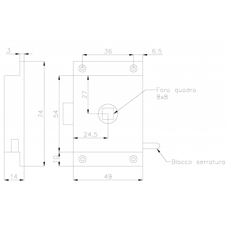 Serratura in ottone cromato con levetta per fermo, dimensioni mm. 75x50, quadro mm. 8