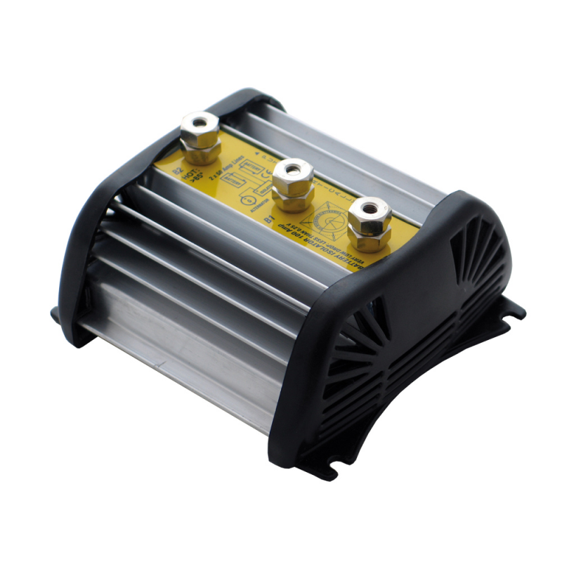 Isolatore ripartitore automatico di batteria a bassissima caduta di tensione (0,25V). Consente di ricaricare due batterie simultaneamente 70 AMP a uscita, fornendo più carica alla batteria più scarica. Realizzato in alluminio con ampia alettatura atta a dissipare efficacemente il calore. Dim. 130x130x70 mm.