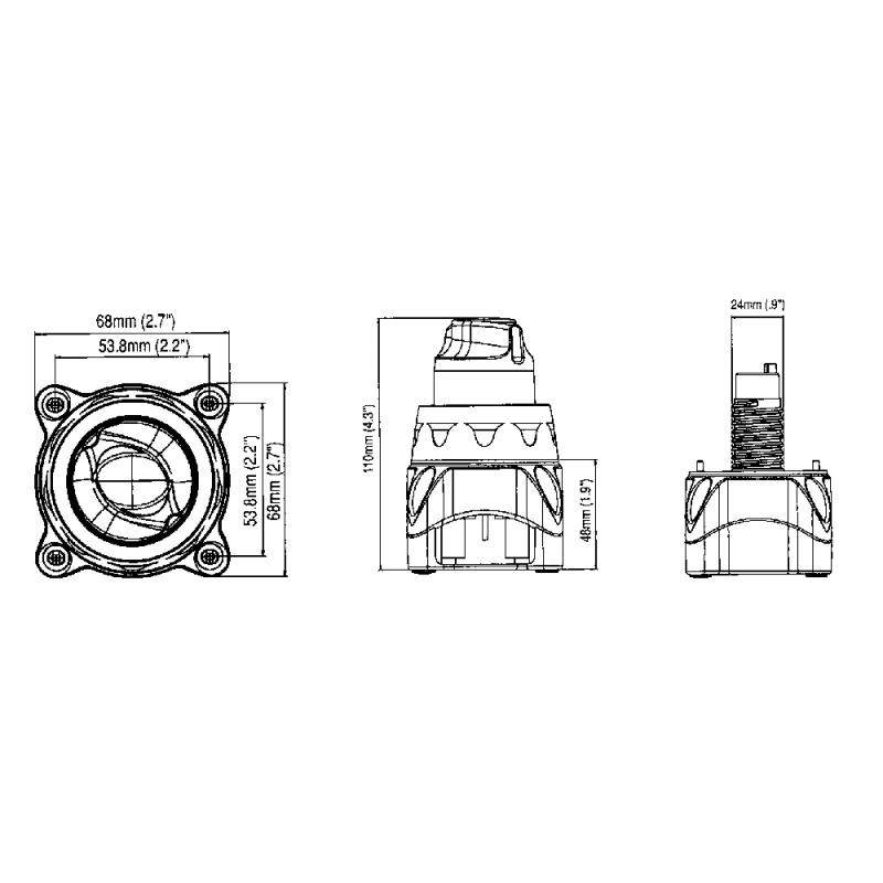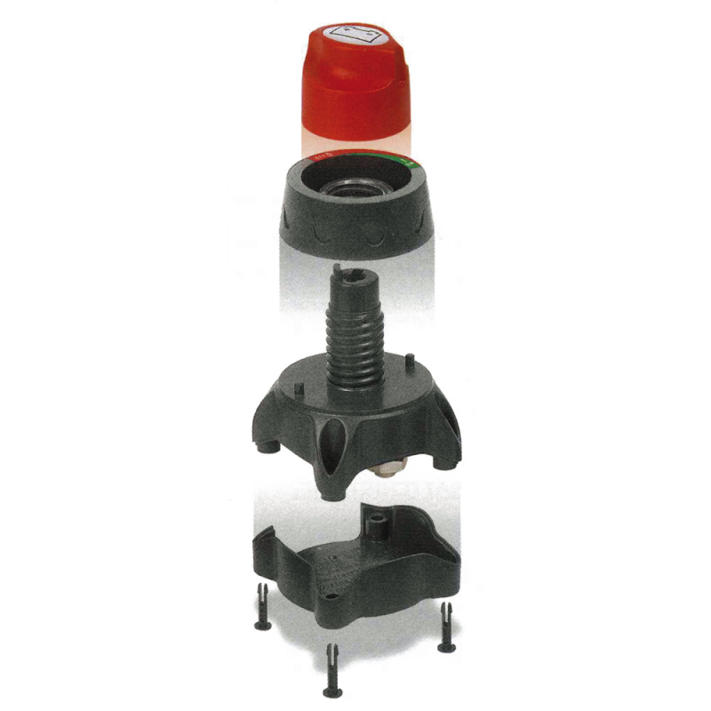 Stacca batteria BEP con manopola estraibile ruotandola di 45° in senso antiorario. 275 AMP in servizio continuo, 1250 AMP di spunto. Montaggio in piano o ad incasso mediante la ghiera filettata fino a 19 mm. di spessore. Terminali di collegamento: 2x10 mm.
