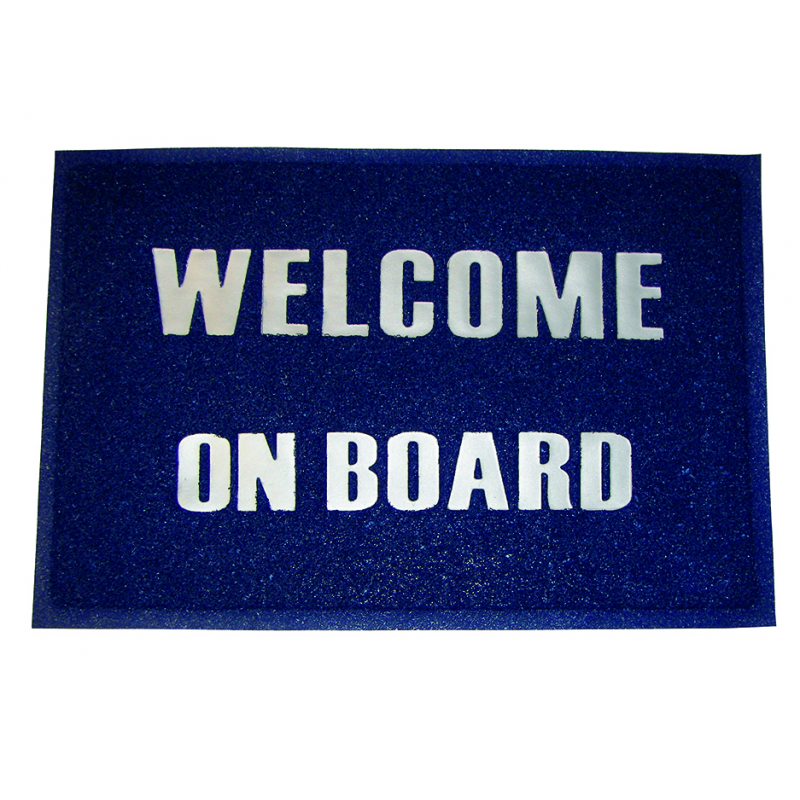 Stuoino “Benvenuto” in morbido e resistente PVC antiscivolo, antiolio, benzina, acqua di mare e raggi U.V. Lo strato superiore è costruito per intrappolare lo sporco e la polvere. Per la pulizia utilizzare un aspirapolvere, sbattere o lavare con detergenti non aggressivi. Colore Blu. Dim. mm 600x400