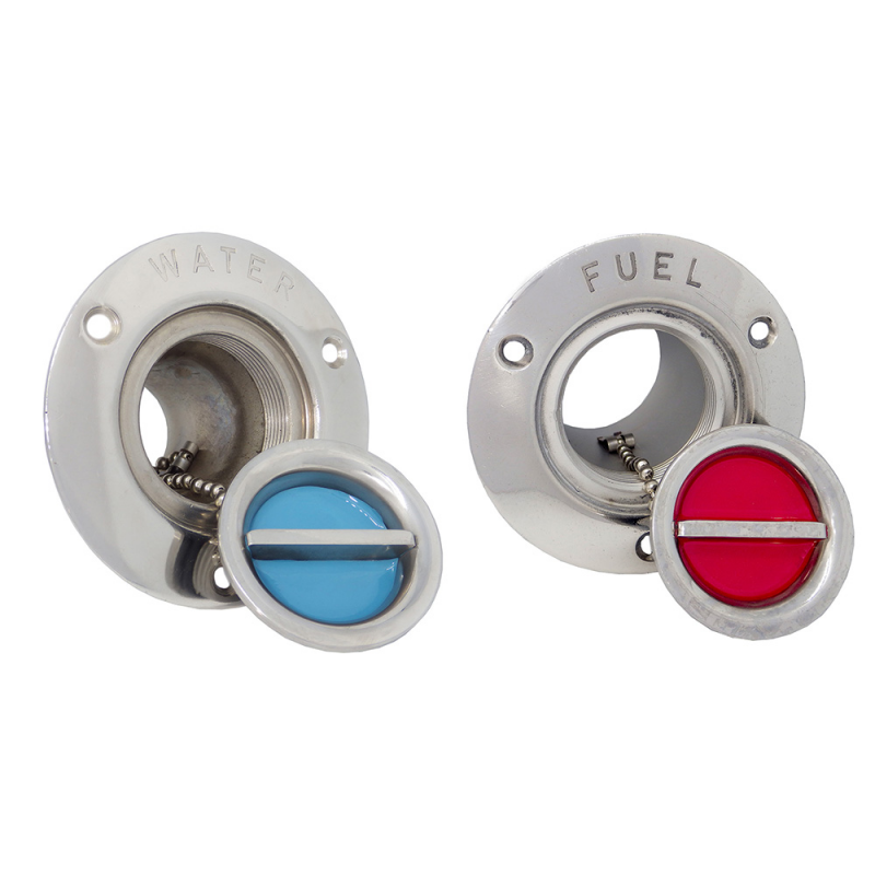 Tappo imbarco in acciaio inox AISI 316 lucidato a specchio con catenella di sicurezza e maniglietta di apertura, tutto completamente a filo. Ø tappo esterno mm 84.