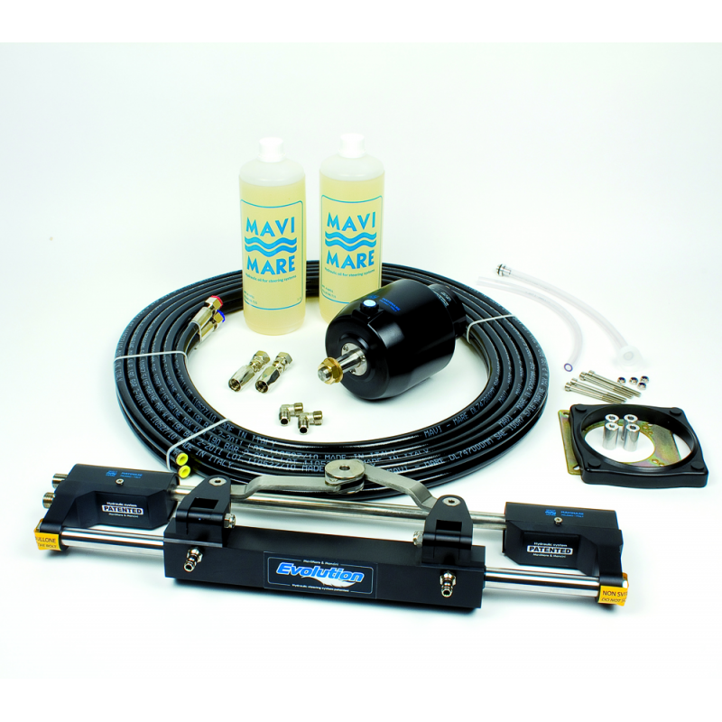 Kit GF300BT universale per tutti i motori fino a 300Hp, comprende:- Pompa GM2-MRA01 a montaggio frontale, dotata di valvola di non ritorno e sovrapressione. Possibilità di montaggio a semincasso mediante flangia quadrata inclusa: Pistoni 7, Volume 27 cm3, pressione max 60 bar, peso 5,5 kg. - Cilindro MC300BHD, volume 130 cm3, corsa 198 mm- Olio idraulico 2 lt, 2 tubi lung. mt. 7,50, raccordati da solo un lato + 2 raccordi recuperabili per effettuare la lunghezza desiderata.