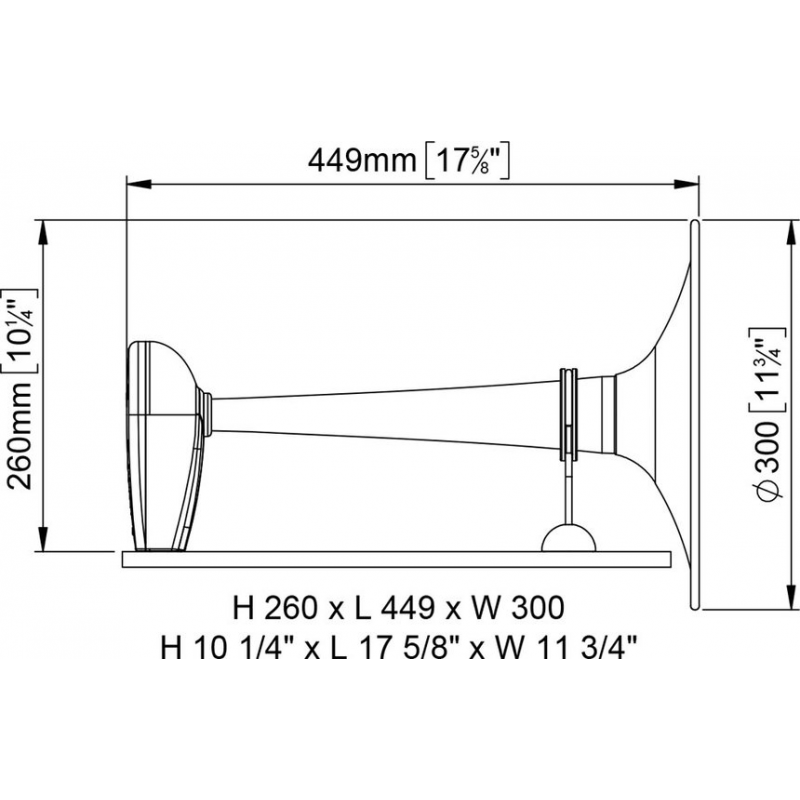 Tromba omologata R.I.Na. ELE/118208CS/001 e LLOYD’S REGISTER MCA Bureau Veritas e NMMA in accordo alle norme internazionali COLREG 72 IMO classe III. Per imbarcazioni da diporto e lavoro da 20 a 75 mt., livello sonoro 132 dB, 315 Hz. Solo corno colore bianco, funziona con I’aria compressa disponibile a bordo, 6/12 atm. Peso kg. 3,5. Alimentazione 24V, ass. 2,5 Amp.