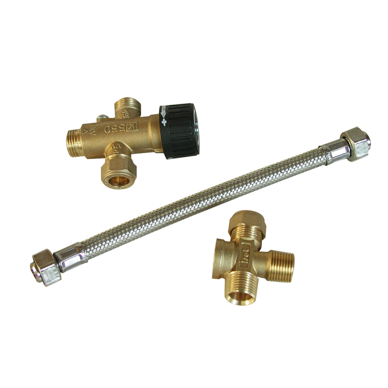 Valvola miscelatrice, permette di regolare la temperatura dell’acqua in uscita. Raccorderia da 1/2 pollice.