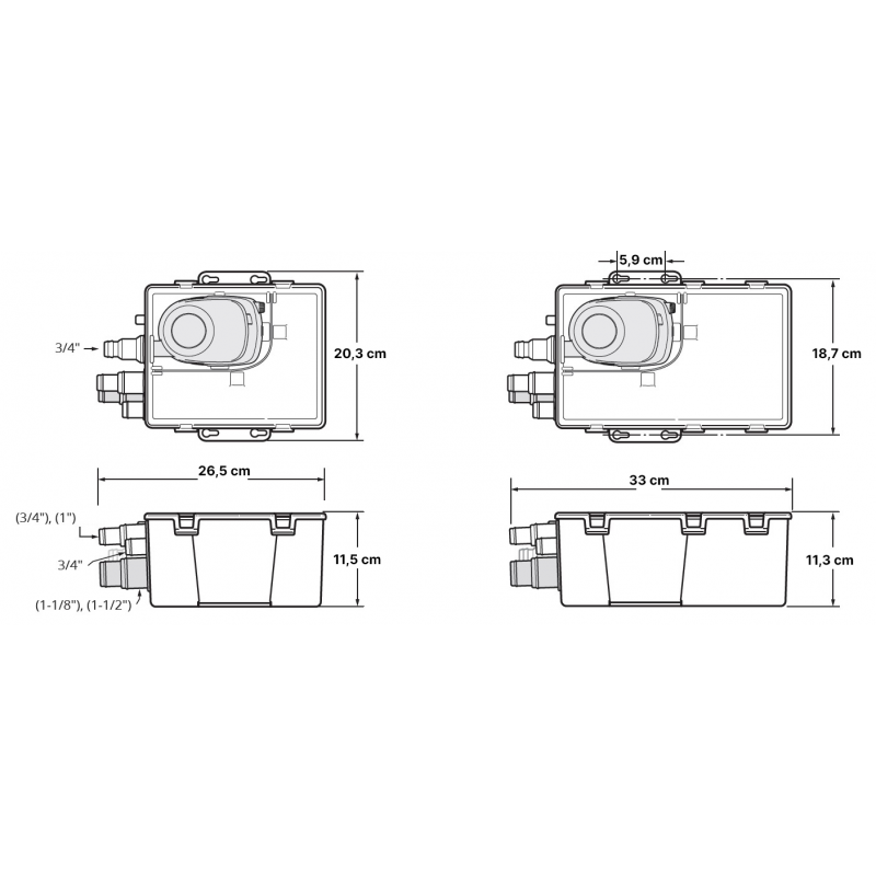 Sistema di scarico per la doccia composto da un pozzetto che contiene un interruttore galleggiante privo di mercurio e da una pompa. La pompa si avvia automaticamente e rimuove l’acqua accumulata mentre il pozzetto si riempie. Una valvola di ritegno nel collettore di aspirazione impedisce il funzionamento ciclico della pompa e riduce l’odore di acqua stagnante. Un coperchio in plastica trasparente con guarnizione consente una facile ispezione e manutenzione del filtro. E’ dotata di più portagomma di ingresso che possono essere tagliati su misura per adattarsi alle diverse dimensioni dei tubi (da 3/4” a 1-1/2”) consentendo il collegamento di più scarichi. Il Ø del portagomma di scarico è sempre da 3/4”. Utilizzabile per drenare docce, lavandini, lavelli della cambusa, ecc.