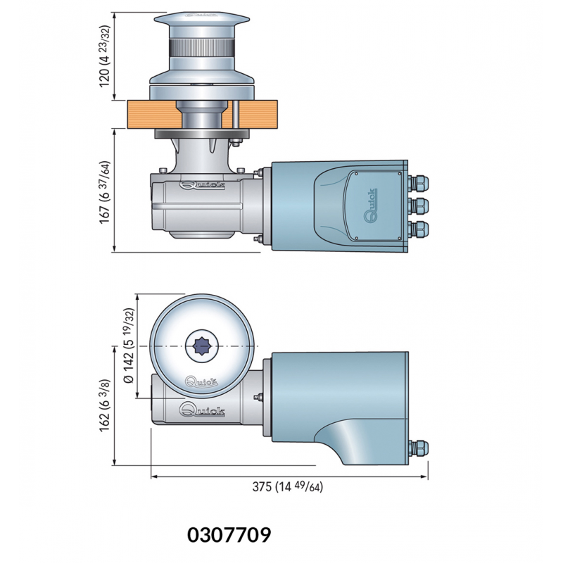 Verricelli da tonneggio, base e campana in acciaio inox Aisi 316, motore stagno IP67. Riduttore in alluminio anodizzato. Per barche 14-18 mt. Campana Ø mm. 142. 1000W, 24V, Tiro max istantaneo 1000 Kg., Velocità di recupero 27 mt/min, Peso 17,3 Kg.